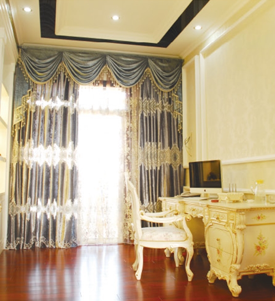 在歐式風(fēng)格的設(shè)計(jì)中,歐陸情韻的窗簾時(shí)必不可少的裝飾之一,華麗的提花映襯在湖藍(lán)色的窗簾上栩栩生輝,波浪簾頭優(yōu)雅富麗。整體色彩與鑲金的寶藍(lán)色布藝沙發(fā)相互照應(yīng),明艷高貴。
