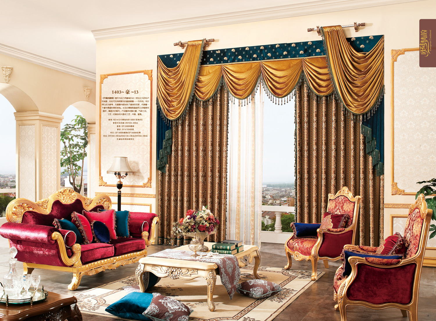 花型、色彩及款式:融合各種歐式花卉及卷草圖案。以金色調(diào)為主,酒紅、紫紅等為配色,搭配層次豐富的水波簾頭款式及歐式花邊進(jìn)行設(shè)計(jì)。(如:吊珠類花邊等)